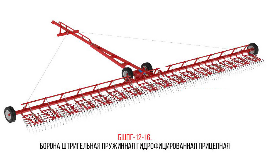 Борона Штригельная Прицепная Гидрофицированная БШПГ – предназначена для уничтожения сорной растительности, создания аэрационного режима в поверхностном слое почвы и разрушении почвенной корки. Борона может использоваться для довсходового и послевсходового боронования технических и зерновых культур, а также для выравнивания поверхности поля.
