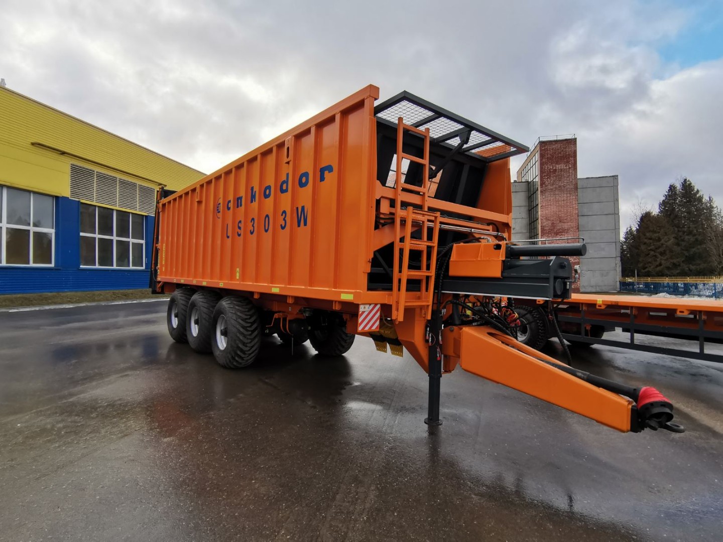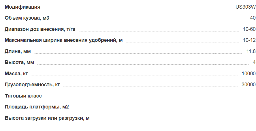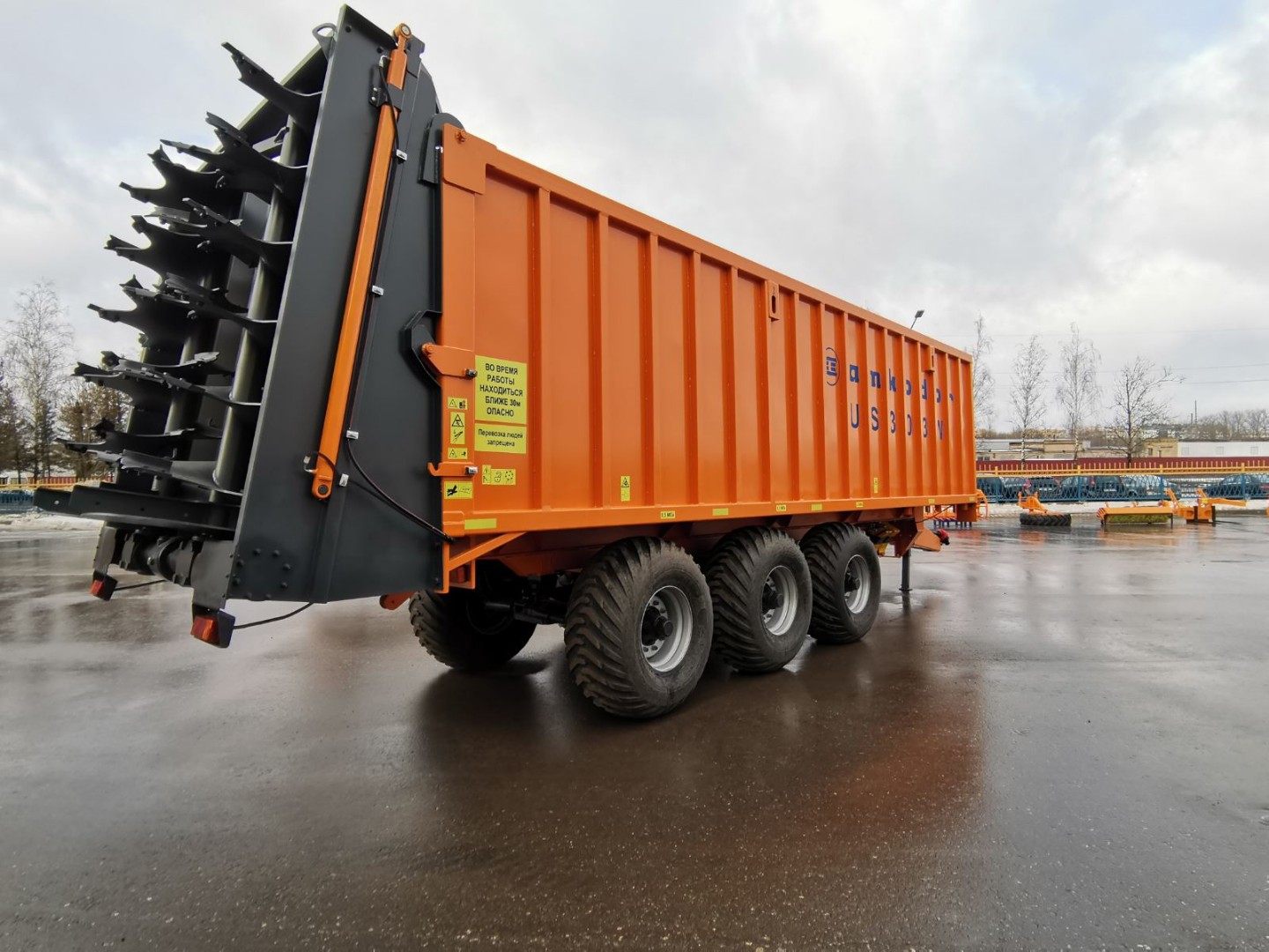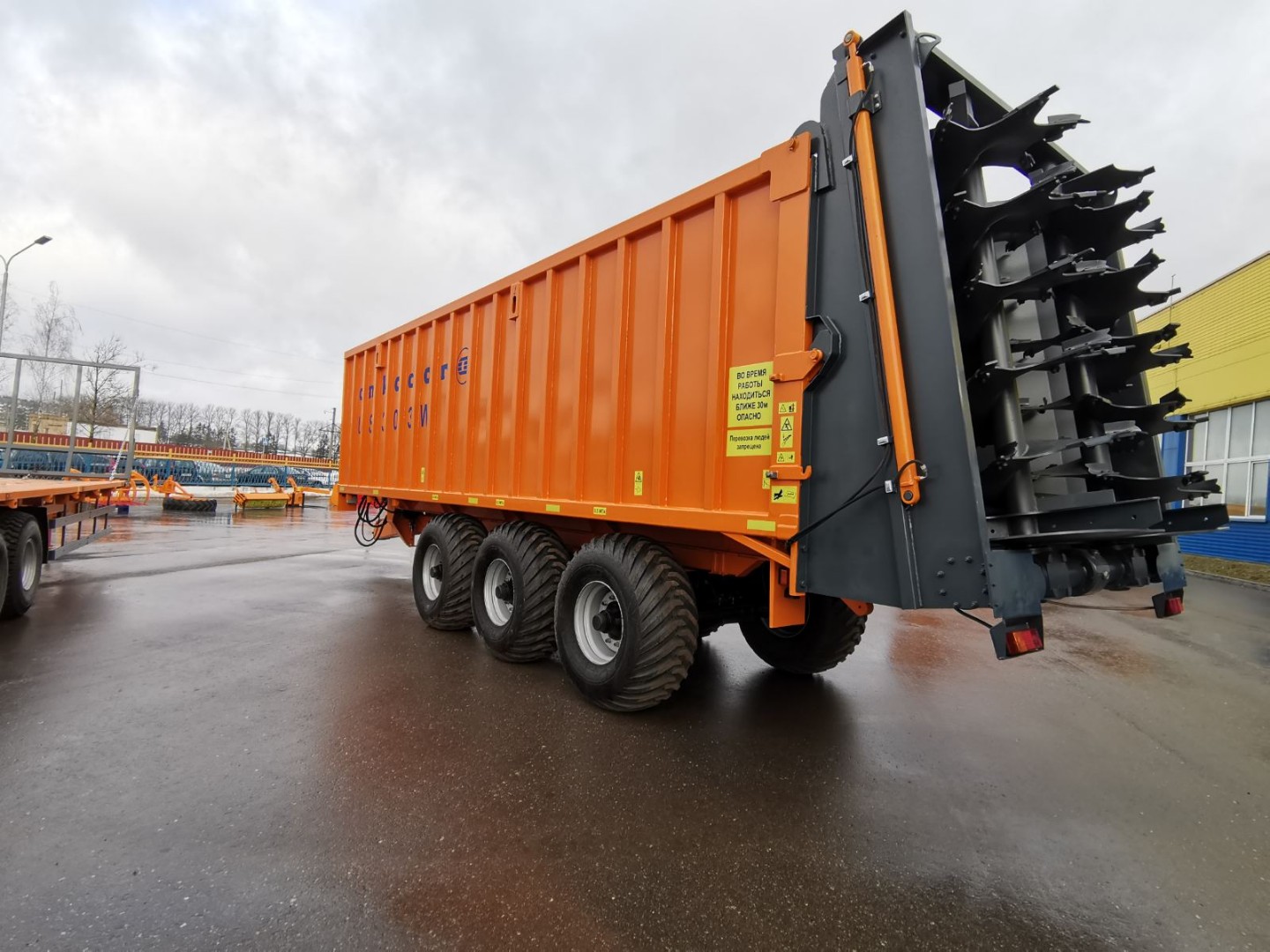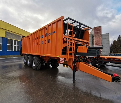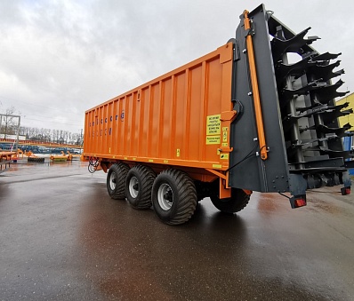 Полуприцеп для перевозки сыпучих грузов и внесения твердых органических удобрений оснащен тремя подрессоренными осями с дублированием поворота первой и третей оси. Использование трех осей позволяет снизить давление на поверхность почвы и не допускает ее переуплотнение. Дублирующие поворотные оси облегчают маневрирование на закрытых площадках, на узких дорогах при совершении поворота, а также значительно увеличивает срок эксплуатации шин в сравнении с пассивными осями. Разгрузка полуприцепа осуществляется за счет активного толкающего борта. Данное конструктивное решение гарантирует выгрузку без застревания легких объемных грузов в верхней части полуприцепа. Важным преимуществом данной системы выгрузки является цельнометаллическая емкость кузова, что полностью исключает потери мелких сыпучих грузов как при транспортировке, так и при выгрузке.