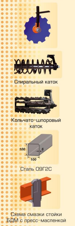 БДМ комплектуется спиральными или кольчато-шпоровыми катками, предназначенными для измельчения, выравнивания и уплотнения почвы.