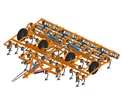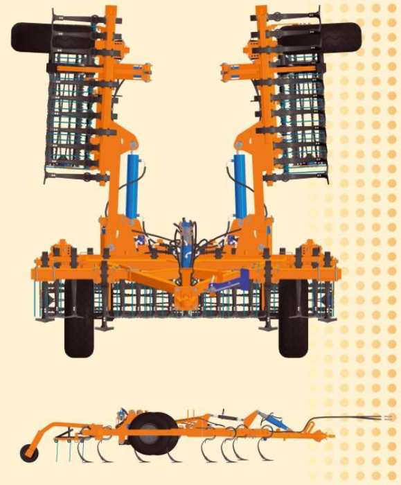 Четырехрядное расположение культиваторных лап с шагом по следу 170 и 230 мм, дополнительным усилителем пружинной стойки, высокое расположение рамы, наличие 3-х рядов пружинных зубьев с регулируемым углом атаки обеспечивают высокую проходимость культиватору и универсальность его применения.