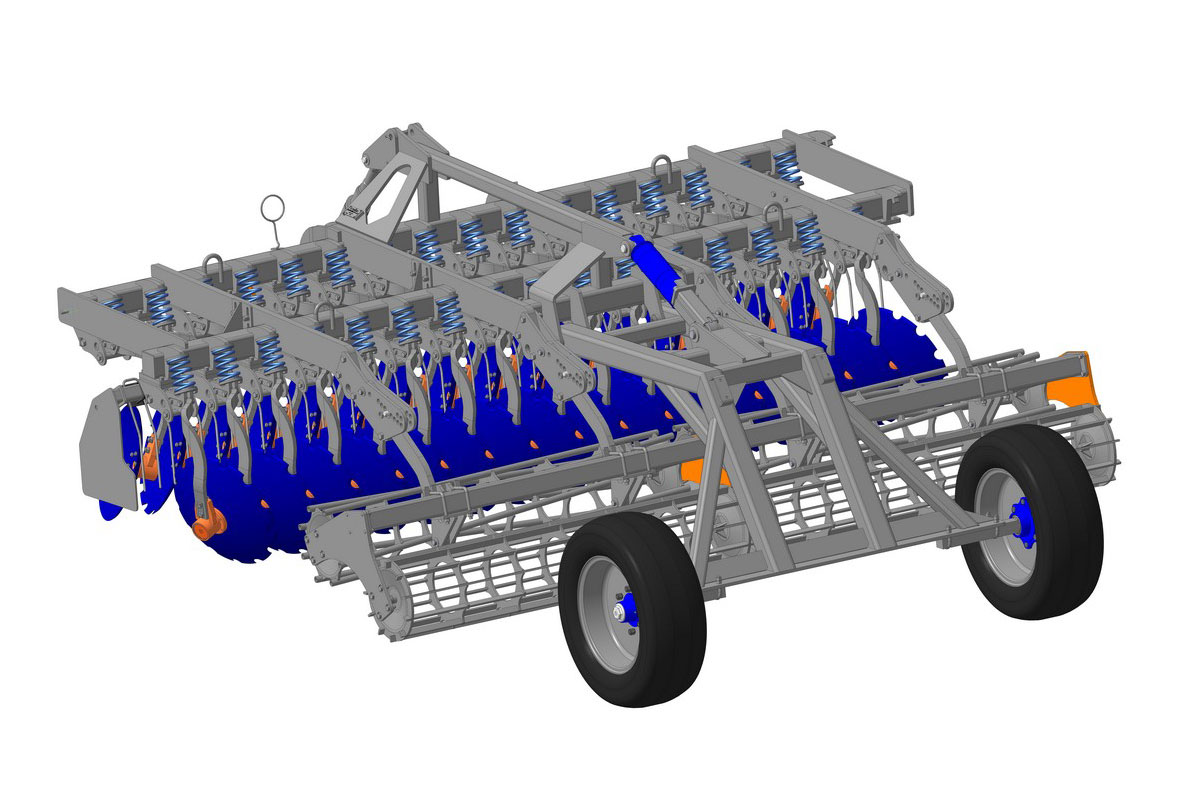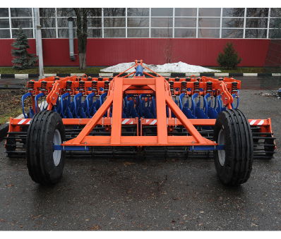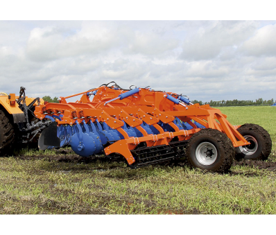 Диски изготовлены из борсодержащей стали ЗОМпВб. После закалки и отпуска сталь приобретает высокую прочность и твердость, которые обеспечивают повышенную эксплуатационную стойкость готовых изделий — их ресурс выше по сравнению с продукцией из стали 65Г. Нестандартное расположение каждого диска на индивидуальной подпружиненной стойке способствует улучшению агротехнических показателей обработки почвы, а также снижению тягового усилия трактора и ГСМ. Установка дисков на индивидуальных подпружиненных стойках исключает забивание междисковых пространств растительными остатками, и отпадает необходимость применения в конструкции чистиков. Диски благодаря такому креплению двигаются стабильно в почве без бокового отклонения. Еще одно преимущество такого крепления — надежная защита от перегрузок. Режущие узлы не обслуживаемые. Смазывания не требуется. Сдвоенные катки (трубчатый и пластинчатый) обеспечивают точность глубины обработки до 1 см с одновременным выравниванием и прикатыванием почвы. Ходовая тележка представляет собой сварную конструкцию из трубы с установленными на конических подшипниках ступицами колес. Агрегаты предназначены для работы на всех почвах с влажностью не более 23%, уклоном поверхности поля не более 102, твердостью почвы в обрабатываемом слое не более 3,0 МПа. Не допускается применение мульчировщиков на почвах, на которых имеются пни, корни деревьев и засоренность каменистыми включениями в объеме более 0,5%, размером свыше 100 мм.