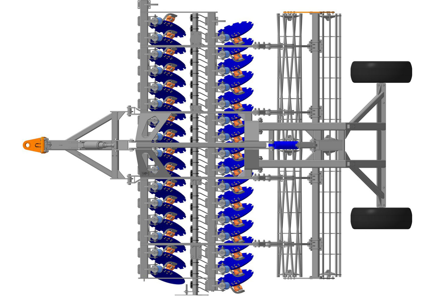 ДМ-8х2СП — Рама хребтовая является основным несущим элементом конструкции и предназначена для установки на нее ходовой тележки, сцепного устройства, а также монтажа гидросистемы мульчировщика и установки центральной рамы. Представляет собой сварную конструкцию из трубы прямоугольного сечения 350x250x12 мм. На переднем и заднем концах рамы имеются кронштейны для установки сцепки и ходовой тележки, а также кронштейн для крепления фиксатора рам боковых для перевозки в транспортном положении. Основные характеристики сцепки, тележки (преимущества): гидравлическая система позволяет комбинированное плавное управление гидроцилиндрами сцепки и ходовой тележки при различных манипуляционных действиях.