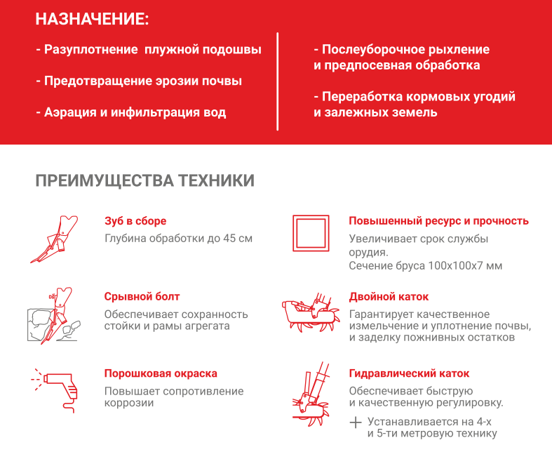 Глубокорыхлитель КАМА TIGER применяют для глубокого рыхления непромокаемого уплотненного слоя почвы, чтобы разуплотнить плужную подошву без повреждения стерни и без оборота пласта. Глубокорыхлители КАМА TIGER улучшит водно-воздушный режим корневого слоя почвы, предотвратит развитие эрозии почвы, будет способствовать накоплению влаги и повышению урожайности сельскохозяйственных культур.
