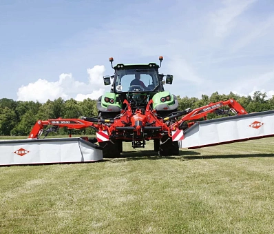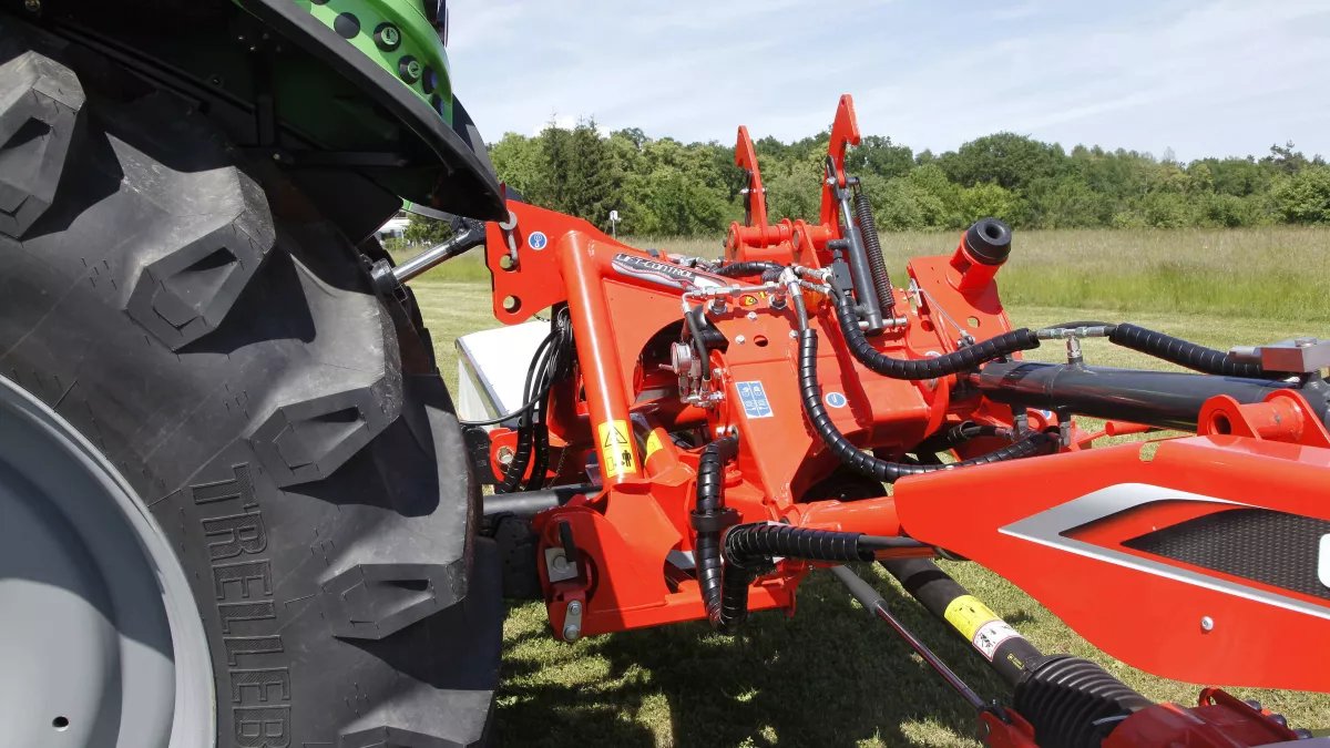 Возможность подъема двух задних частей по отдельности является существенным преимуществом при кошении участков треугольной формы. Маневрирование теперь не представляет сложности и выполняется быстрее. Блок косилки приводится в транспортное положение с помощью клапана двойного действия.