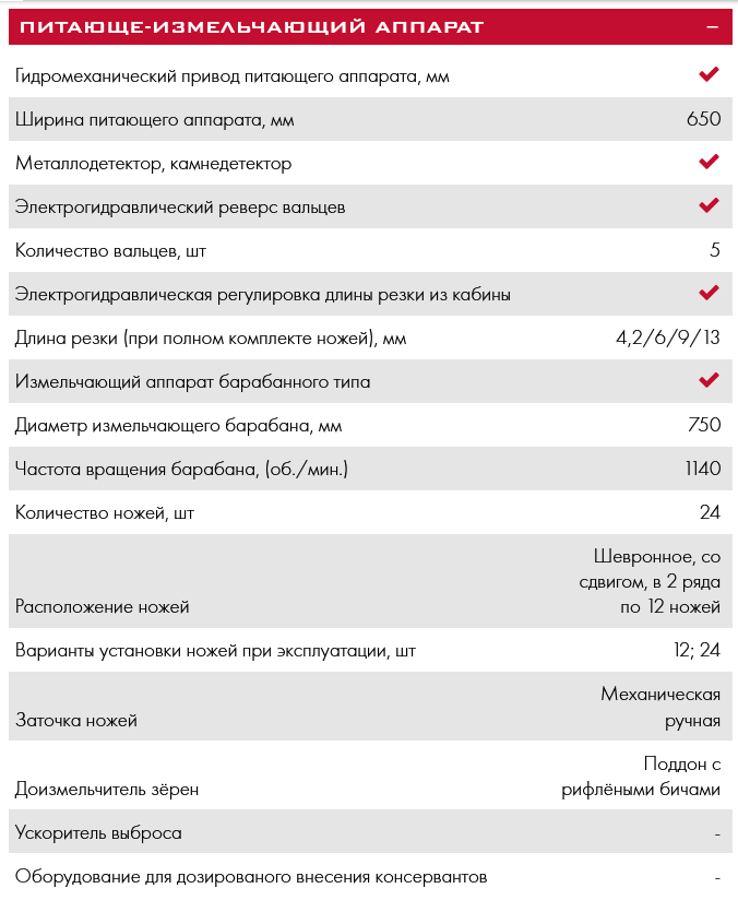 • 24 ножа измельчающего барабана обеспечивают косой чистый срез. Вращаясь с частотой 1173 об/мин, измельчающий барабан поддерживает высокую скорость проводки кормов. Регулирование длины резки производится из кабины, автоматика поддерживает 4 режима длины резки, обеспечивая сечку 4,2/6/9/13 мм. Остроту ножей позволяет поддерживать механическое заточное устройство. Абразивный брусок подается к ножам автоматически в зависимости от горизонтального перемещения каретки.