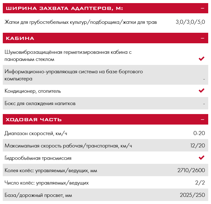 • Жатка для трав. Система копирования рельефа поля и установка высоты среза гарантирует одинаково ровный срез. Обгонная муфта шкива привода мотовила предотвращает повреждение мотовила при обратном вращении шкива.