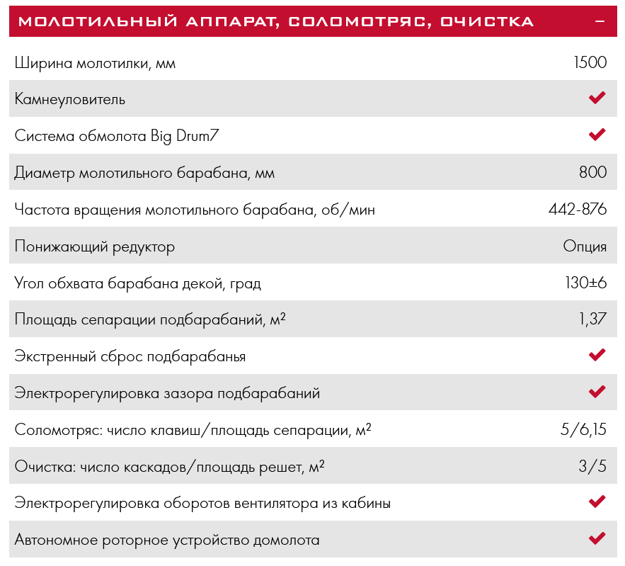 - Высокоинерционный молотильный барабан максимально большого диаметра и подбарабанье с углом обхвата 130° обеспечивают условия для качественного обмолота, в том числе на высокостебельных, скрученных и засоренных хлебах.