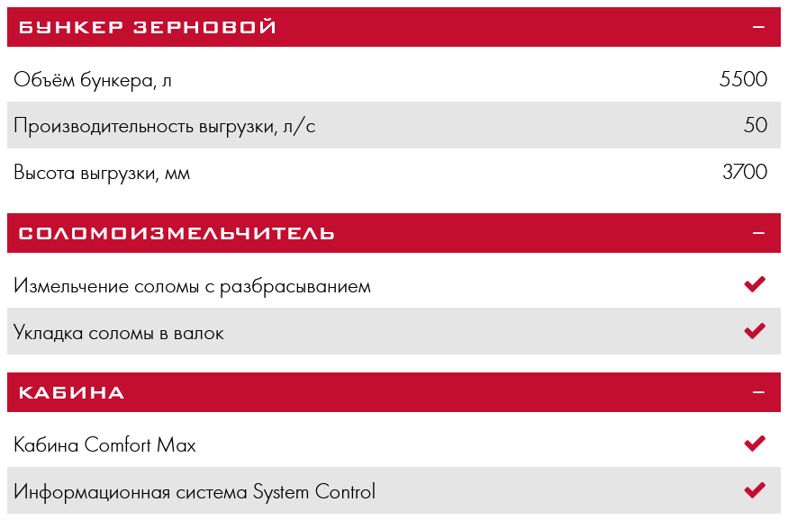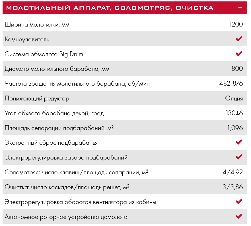 - Высокоинерционный молотильный барабан максимально большого диаметра и подбарабанье с углом обхвата 130° обеспечивают условия для качественного обмолота, в том числе на высокостебельных, скрученных и засоренных хлебах.