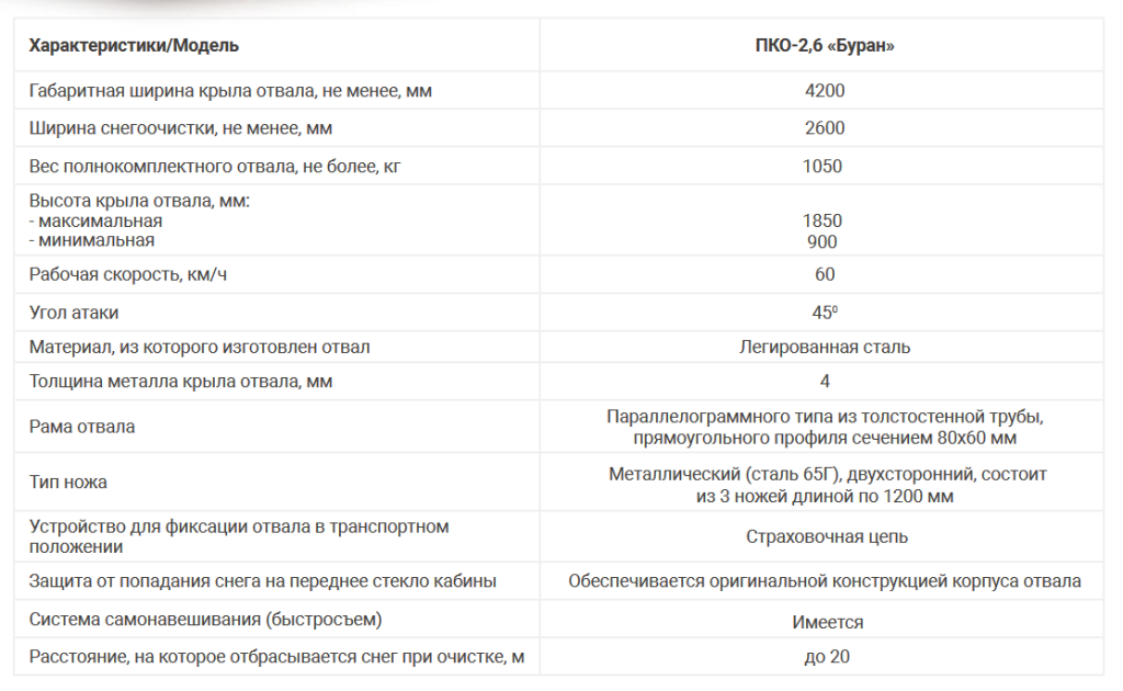 • ширина очищаемой полосы — 2600 мм, угол атаки — 45°;
