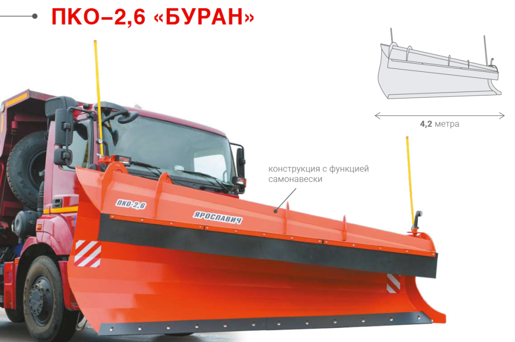 Высокий скоростной передний косой отвал ПКО-2,6М «БУРАН» предназначен для скоростной очистки автомобильных дорог от свежевыпавшего снега, а также удаления с проезжей части шуги и наледи.