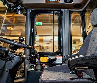 - Большой угол обзора, эффективное рабочее освещение, стеклоочистители на переднем и заднем окнах, позволяют сохранять оператору высокую производительность в различных погодных условиях.
