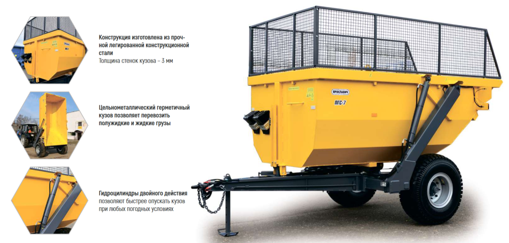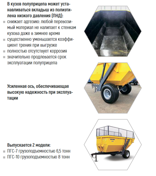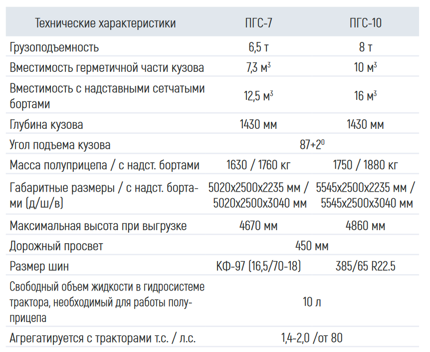 Полуприцепы ПГС-7 и ПГС-10 предназначены для транспортировки различных сельскохозяйственных грузов: зерновых, корнеплодов, твердых, полужидких и жидких органических удобрений, строительных материалов и других грузов по всем видам дорог, а также в полевых условиях. При использовании надставных бортов возможно перевозить сено, сенаж, зерносенаж, силос.