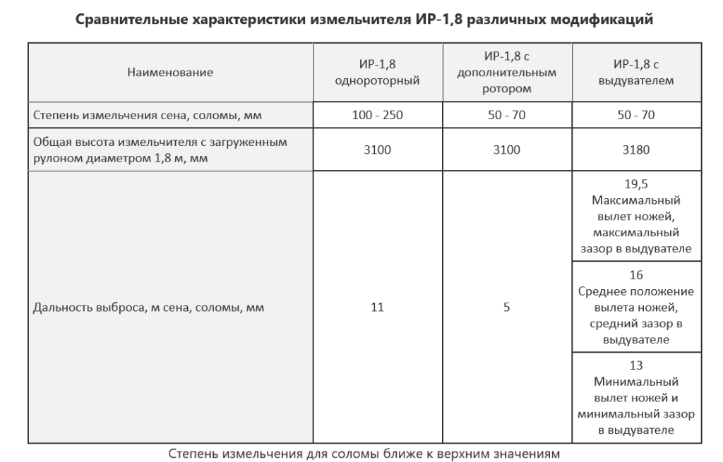 Обновленная модель измельчителя соломы ИР-1,8 с выдувателем отличается увеличенной в 1,5 раза дальностью вылета измельченной массы за счет увеличенного диаметра выдувателя. Дальность вылета измельченной массы достигает 19,5 метров.