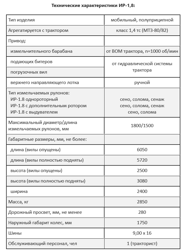 Измельчитель ИР-1,8 с дополнительным ротором имеет доизмельчающий ротор, позволяющий получить повышенную степень измельчения сена 50-70 мм. Возможна работа измельчителя в однороторном варианте. Управление измельчителем производится с помощью тросового гидрораспределителя из кабины трактора.
