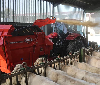 В случае с тяжелыми кормами (корма с длинными волокнами и тюки сенажа), низкое расположение стрелы не позволяет фуражу попасть в турбину. Таким образом, волокна эффективно и равномерно распределяются.