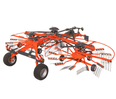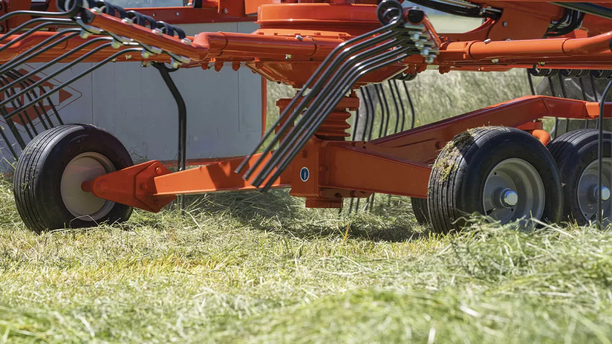 - Четыре колеса на каждом роторе, расположенные максимально близко к граблинам, обеспечивают отличное сцепление с землей. Тандемное шасси с шестью колесами рекомендуется всем, кто хочет добиться еще более совершенных результатов (опциональное оснащение для GA 8731 и стандартное для GA 9531).