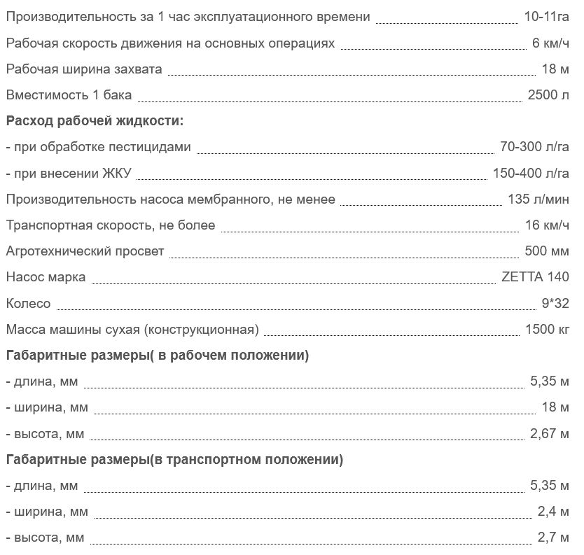 Прицепной опрыскиватель ОП 18-2500 был спроектирован с учетом всех современных требований применимых к данному виду техники. При этом особое внимание уделялось прочности металлоконструкции рамы и штанги, надежности гидросистемы, качественному распылению раствора. Опрыскиватель ОП 18-2500 оснащен комплексом оборудования, который обеспечивает высокую производительность, надежность, удобство в работе, а также делает его эксплуатацию экологически безопасной.