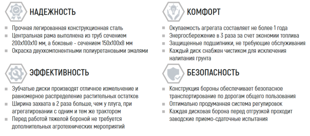 Уникальность формы дисков тяжелой бороны позволяет им достаточно легко входить в необработанный пласт и производить хорошее измельчение растительных остатков с последующим равномерным заделыванием их в почву на всю глубину. Помимо этого, агрегат имеет принцип батарейного расположения рабочих органов, что дает возможность выполнять надлежащее выравнивание поверхности поля, а возможность изменения угла атаки дисковых батарей способствует наилучшему крошению почвы. В этом случае механизм работы диска можно описать следующим образом: режущая кромка диска, установленного под углом к направлению движения, в процессе работы отрезает полоску почвы и поднимает ее на внутреннюю сферическую поверхность, в результате чего она крошится, частично оборачивается и перемешивается.