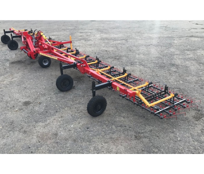 Штригельная борона оснащена пружинными зубьями со специальной гидравлически складной рамой и имеет ширину захвата  от  9 - 24 метров.