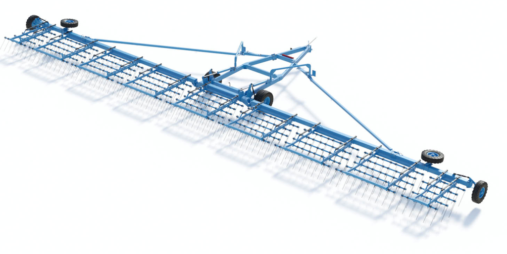 Борона с пружинным зубом полуприцепная гидрофицированная тяжелая ПОБЕДА БЗГТ-25. Ширина захвата бороны — 25,7 м. Производительность 25-36 гектаров в час.