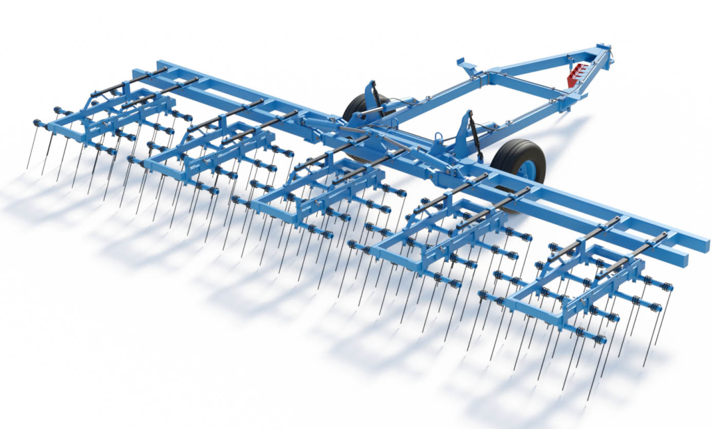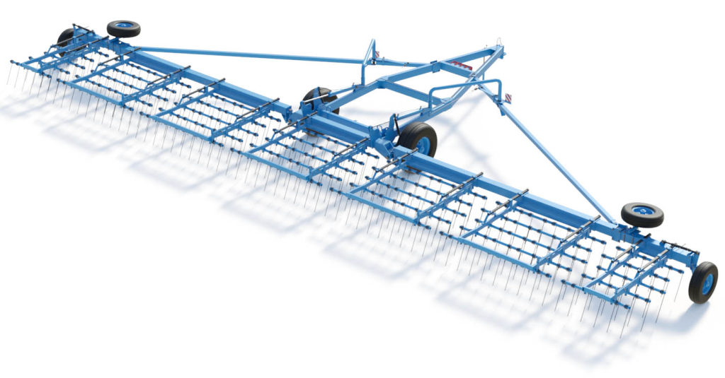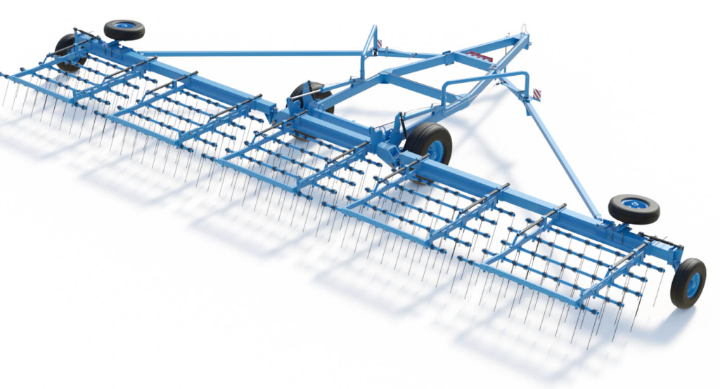 Борона с пружинным зубом полуприцепная гидрофицированная тяжелая ПОБЕДА БЗГТ-15. Ширина захвата бороны — 15,9 м. Производительность 15-23 гектара в час.