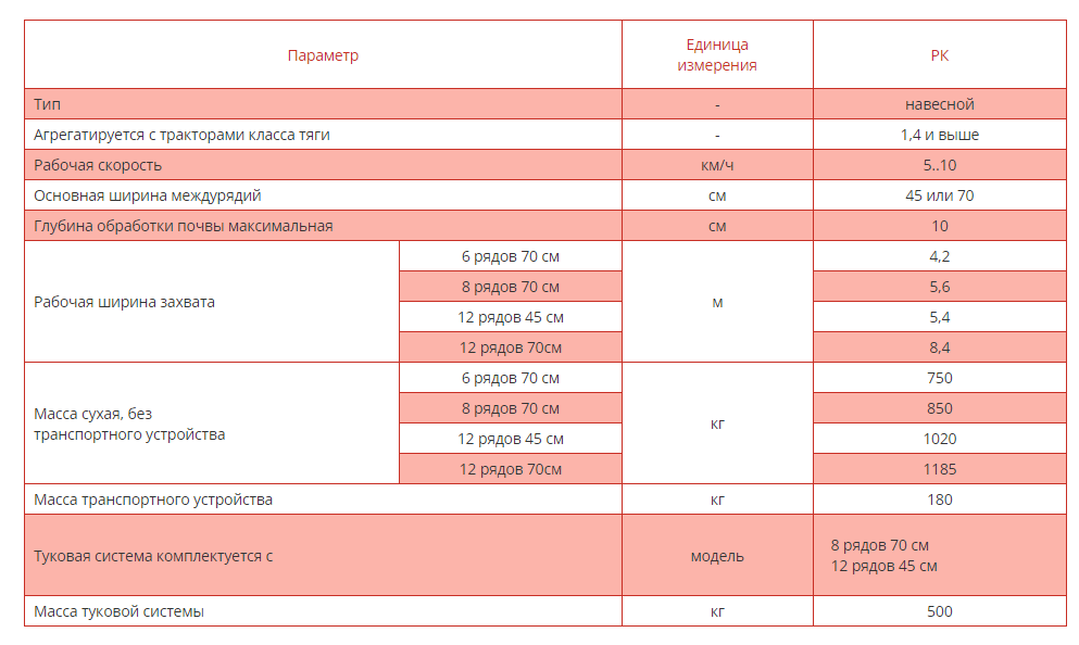 Навесной культиватор РК предназначен для междурядной обработки сои, сахарной свёклы, подсолнечника, кукурузы и других пропашных культур, а также овощных культур. Агрегат может изготавливаться от 6 до 12 рядного с междурядьем 45 см и 70 см, а способ крепления секций к балке обеспечивает быстрое изменение расстояния между рядами. Устройство секции позволяет точно выдерживать глубину обработки почвы до 10 см. Культиватор РК может комплектоваться системой для внесения удобрений, совокупный объем которой составляет 420 л.
